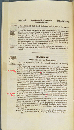 After the Referendum on 21 May 1977, the Constitution Alteration (Referendums) Act 1977 (enacted on 29 July 1977) made the following additions to Section 128: