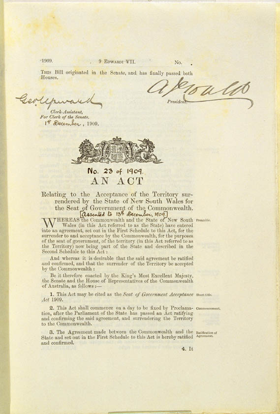 Seat of Government Acceptance Act 1909 (Cth), p1